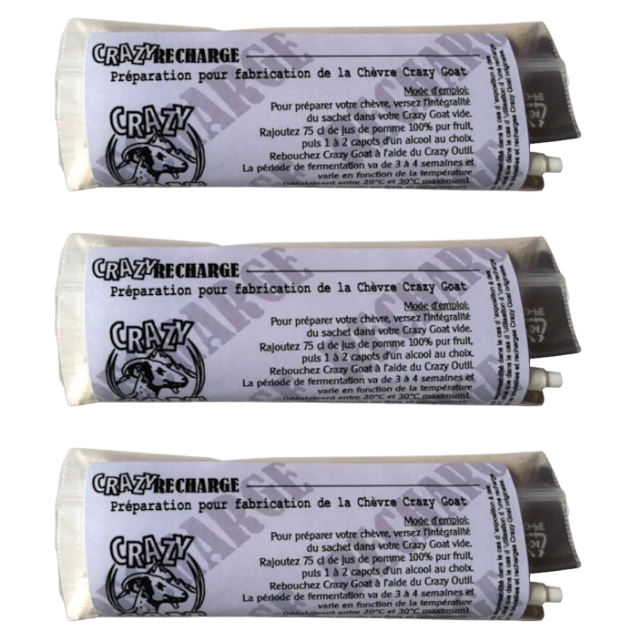 Fonction : La Crazy Recharge permet de réaliser la fermentation naturelle de votre jus de fruit pour produire, en une semaine environ, le gaz et l’alcool nécessaires à votre Chèvre. Elle respecte la tradition savoyarde tout en garantissant un résultat stable et savoureux.